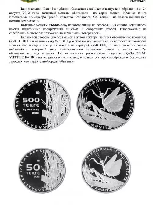 "Национальный банк Республики Казахстан сообщает о выпуске в обращение с 24 августа 2012 года памятной монеты "Богомол" из серии монет "Красная книга Казахстана" из серебра proof-качества номиналом 500 тенге и из сплава нейзильбер номиналом 50 тенге", - говорится в сообщении банка.