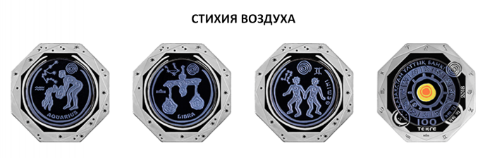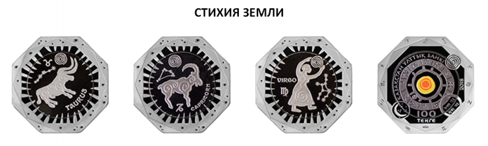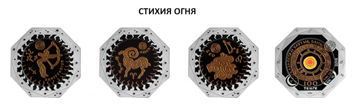 Монеты изготовлены в 12 видах, соответствующих каждому знаку зодиака - "Овен", "Лев", "Стрелец", "Телец", "Дева", "Козерог", "Водолей", "Близнецы", "Весы", "Рыбы", "Рак" и "Скорпион". Дизайн монет выполнен в стилистике наскальной живописи. Каждый цвет танталовой вставки на монете соответствует цвету стихии. Монеты изготовлены из серебра и тантала с применением технологии изменения цвета.