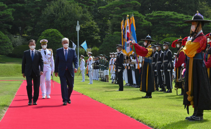 После того как прозвучали государственные гимны Казахстана и Южной Кореи, президенты обошли строй Почетного караула, поклоном поприветствовали флаги двух стран и представили друг другу членов официальных делегаций.