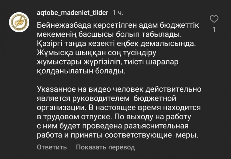 "Указанный на видео человек действительно является руководителем бюджетной организации. В настоящее время находится в трудовом отпуске. По выходу на работу с ним будет проведена разъяснительная работа и приняты соответствующие меры".