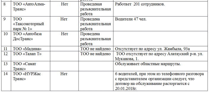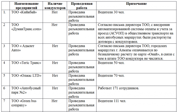 Сообщается, что согласно письму директора ТОО "ДуманТранс.com" (обслуживает маршруты № 11, 20, 21, 17, 27, 111, 133) с момента внедрения электронного билетирования были расторгнуты договоры с кондукторами. В ТОО "Адылет Авто" (обслуживает маршруты № 52, 60, 103) отметили, что пассажиры оплачиают проезд картами "Онай", поэтому в штате нет кондукторов. С остальными автопарками проведены разъяснительные работы.