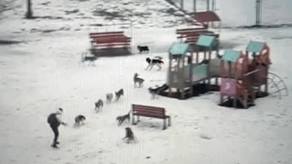 На кадрах видно, как подросток идет по детской площадке. В какой-то момент собаки нападают на него. Молодой человек начинает спасаться бегством. Ему пришлось запрыгнуть на легковое авто. После этого животные убегают.