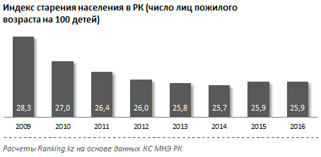 При этом отмечается, что показатели старения в городах Казахстана выше, чем в сельской местности, однако в отличие от села уровень старения горожан снижается. По итогам 2016 года на 100 детей приходилось по 29 стариков, год назад индекс оценивался на уровне 29,2, 7 лет назад - 34,1.