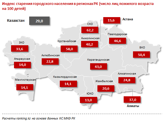 Наиболее высокие актуальные показатели - в городах СКО, индекс старения составляет 62,2 на 100 детей. Самый низкий уровень - в Атырауской области, где на 100 человек от 0 до 15 лет приходится по 14 человек старше 65 лет.