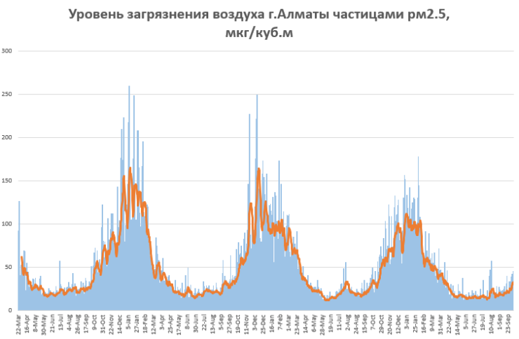 По словам Павла Александрова, летом воздух в Алматы почти соответствует международным нормам, а в период отопительного сезона (примерно с середины октября по середину апреля) уровень загрязнения резко возрастает. И такая динамика наблюдается из года в год.