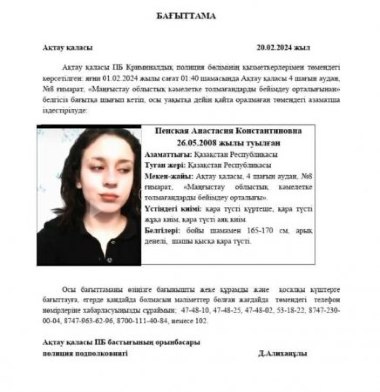 16-летняя Анастасия Пенская пропала 1 февраля. Около 01:40 ночи она ушла из мангистауского областного Центра адаптации несовершеннолетних. В день пропажи девушка была одета в черную куртку, черные легинсы и черно-белые кроссовки.