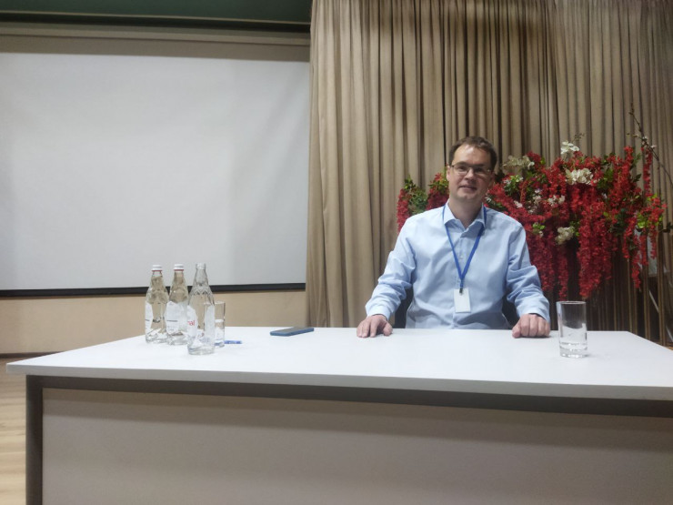 После лекции Владимир рассказал нам, что приехал в Казахстан несколько месяцев назад, чтобы помочь в издании на русском и казахском языке учебников математики, адаптированных под авторскую методику их института. Мы также задали педагогу несколько актуальных вопросов о наших проблемах в сфере образования.