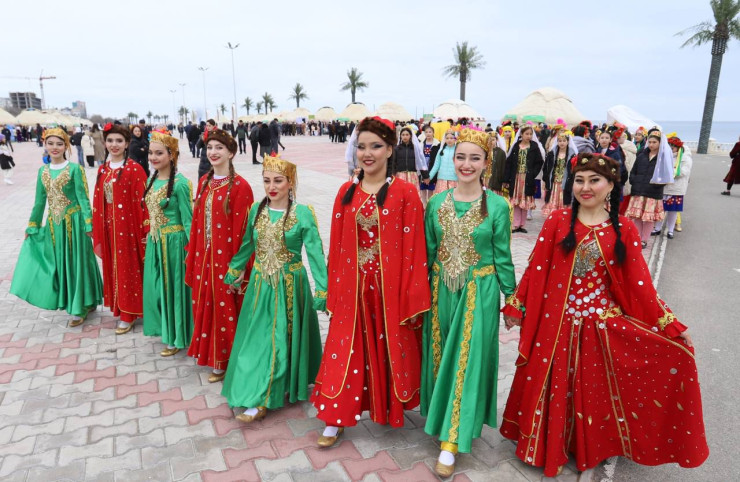 В праздничный день Наурыза 22 марта на городской набережной - вдоль Каспийского моря - раскинулись 27 традиционных казахских юрт, изготовленных из натурального войлока.