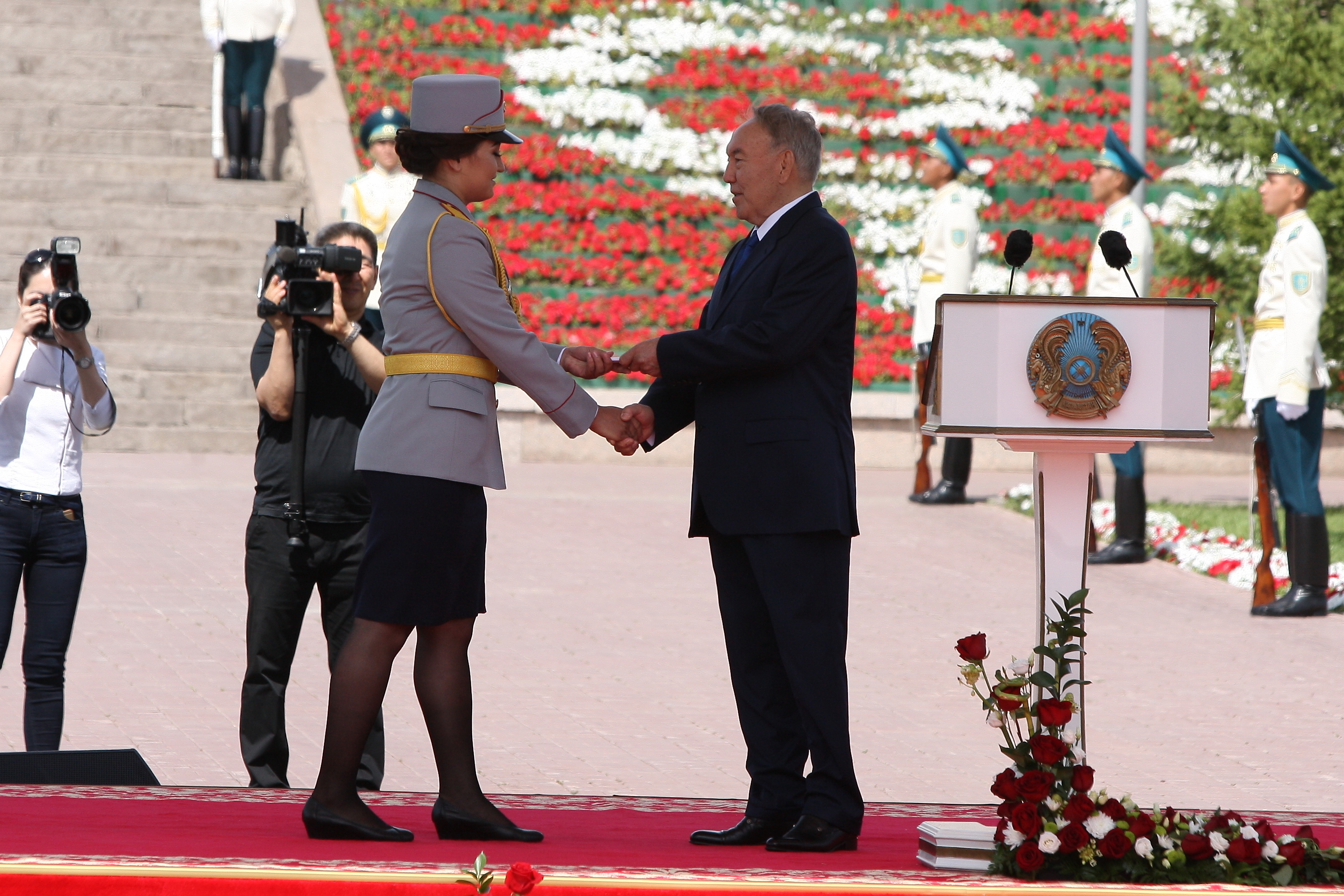 Из рук Главы государства погоны получили 12 выпускников - отличников Военного института сухопутных войск Министерства обороны, Военного института внутренних войск Министерства внутренних дел и Военного института Комитета Национальной безопасности РК. Перед вручением офицерских погон Глава государства поздравил выпускников военных учебных заведений страны, отметив, что офицер, прежде всего, призвание, а уже потом профессия.