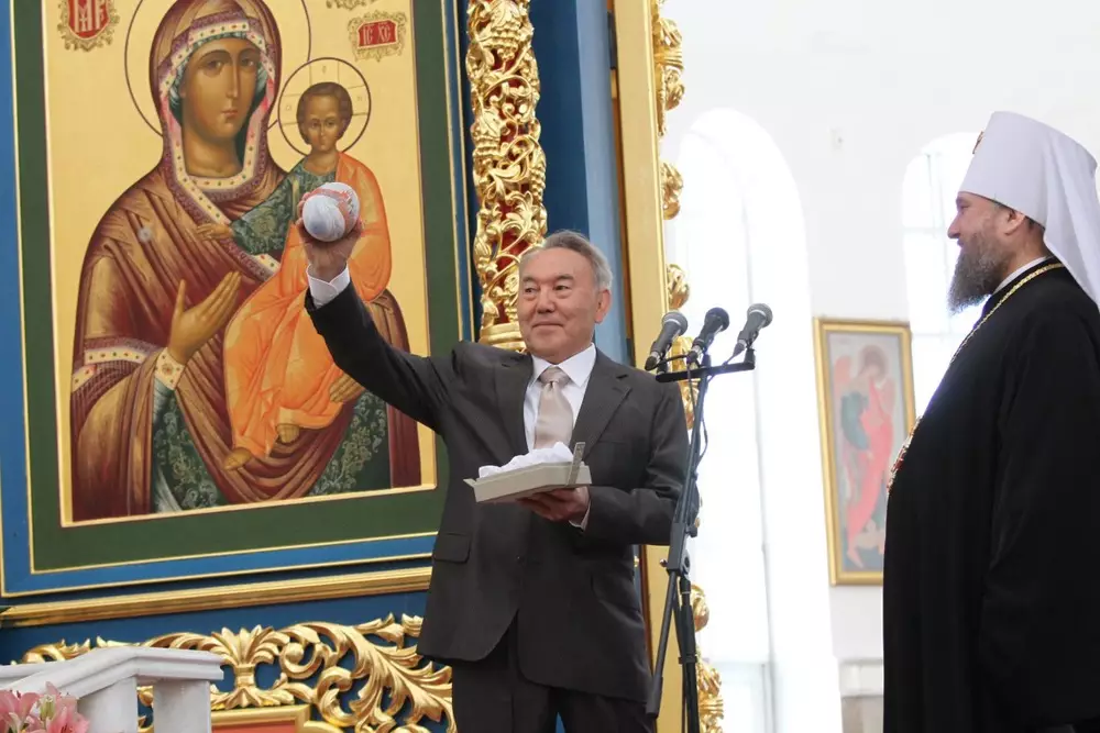 В знак уважения глава Митрополичьего округа Русской Православной церкви в Казахстане митрополит Астанайский и Казахстанский Александр вручил Нурсултану Назарбаеву пасхальное яйцо. "Одна из подвижниц православной веры Мария Магдалина принесла римскому императору Тиберию в знак веры своей пасхальное яйцо. Позвольте и вам с глубоким уважением преподнести этот православный христианский знак, выполненный одним из лучших художников России", - сказал митрополит Александр.