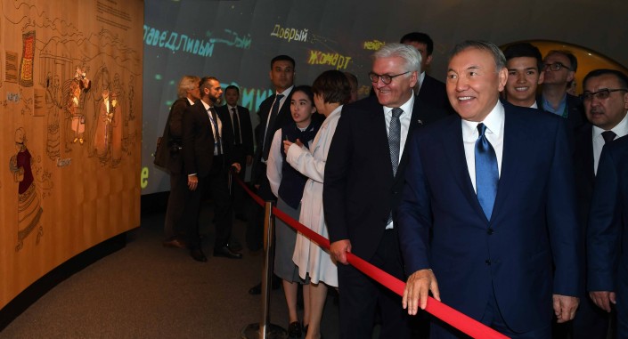 "Здесь лидеры двух стран ознакомились с интерактивными экспозициями, посвященными культуре и истории Казахстана, а также поднялись на восьмой этаж павильона, где расположена экспозиция "Астана будущего". По окончании экскурсии президент ФРГ сделал запись в книге почетных гостей выставки.