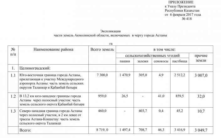 1. Изменить границы города Астаны, включив в его черту части земель Целиноградского района Акмолинской области общей площадью 8 719 гектар, согласно приложению к настоящему Указу.