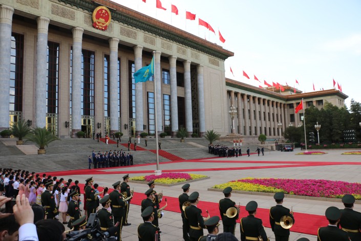 На площади Тяньаньмэнь звучали гимны стран, которые сопровождались грохотом пушек. Гимн Казахстана зазвучал первым.