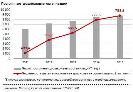Отметим, на рынке доминируют государственные организации. Они оказали 76,5 процента услуг. 23,4 процента услуг оказаны частными организациями и всего 0,1 процента (на 65,7 миллиона тенге) - иностранными. В целом по итогам 2015 года в стране работало 8 834 дошкольных учреждения, которые посещало 758,8 тысячи детей (оба показателя выросли на 4,3 процента в сравнении с 2014 годом). 2 844 организации действовали в городах (их посещали 428,2 тысячи дошкольников) и еще 5 990 - в сельской местности (в них обучались 330,6 тысячи детей).