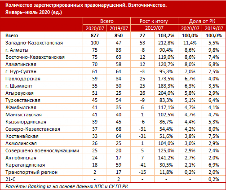Аналитики проекта Ranking.kz рассказали, в каких регионах зафиксировано больше всего правонарушений, относящихся ко взяточничеству, передает Tengrinews.kz.