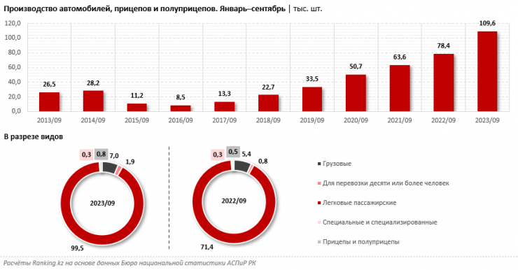 Сообщается, что большая часть произведенных за январь-сентябрь 2023 года автотранспортных средств пришлась на легковые - около 100 тысяч. Следом идут грузовые автомобили (семь тысяч), автобусы (порядка двух тысяч), специальные и специализированные автомобили (346), а также прицепы и полуприцепы (815).