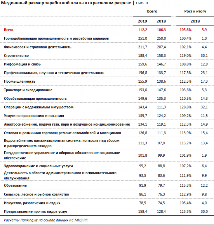 Список наиболее высокооплачиваемых профессий традиционно формируют представители горнодобывающей (251 тысяча тенге), финансовой (211,7 тысячи тенге) и строительной (188,4 тысячи тенге) отраслей.