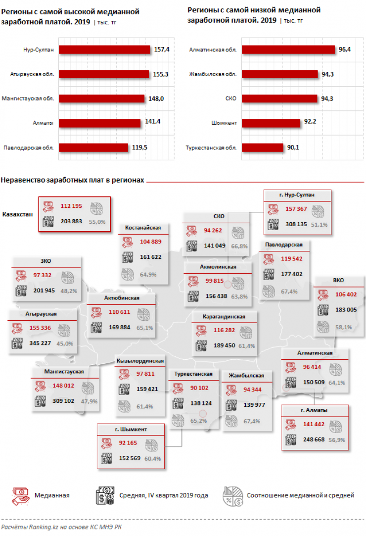 В Нур-Султане по итогам IV квартала 2019 года средняя зарплата составила 308,1 тысячи тенге, тогда как медианная - на 48,9 процента меньше: 157,4 тысячи тенге. В Алматы средняя зарплата находится на уровне 248,7 тысячи тенге, а медианная - 141,4 тысячи, что меньше на 43,1 процента.