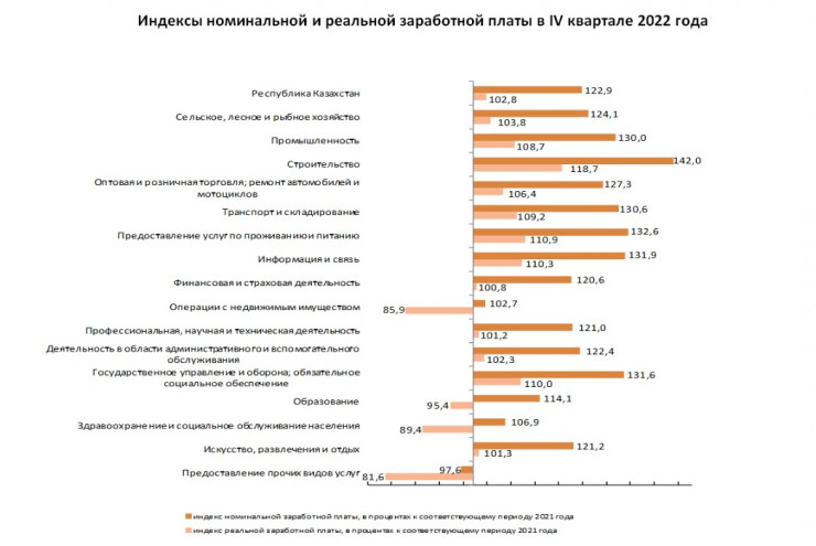 По сравнению с соответствующим кварталом 2021 года наибольший рост среднемесячной зарплаты в Казахстане зафиксирован в отраслях строительства - 42 процента, предоставлении услуг по проживанию и питанию – 32,6 процента, информации и связи - 31,9 процента.