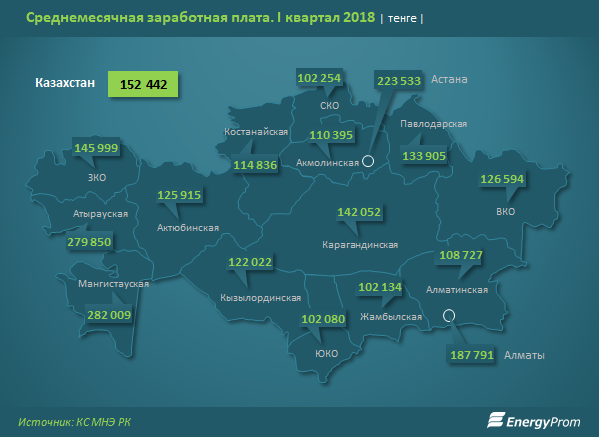 По итогам первого квартала 2018 года среднемесячная заработная плата казахстанцев составила 152,4 тысячи тенге - на 8,7 процента больше, чем в аналогичном периоде прошлого года, сообщается в исследовании Energyprom.kz.