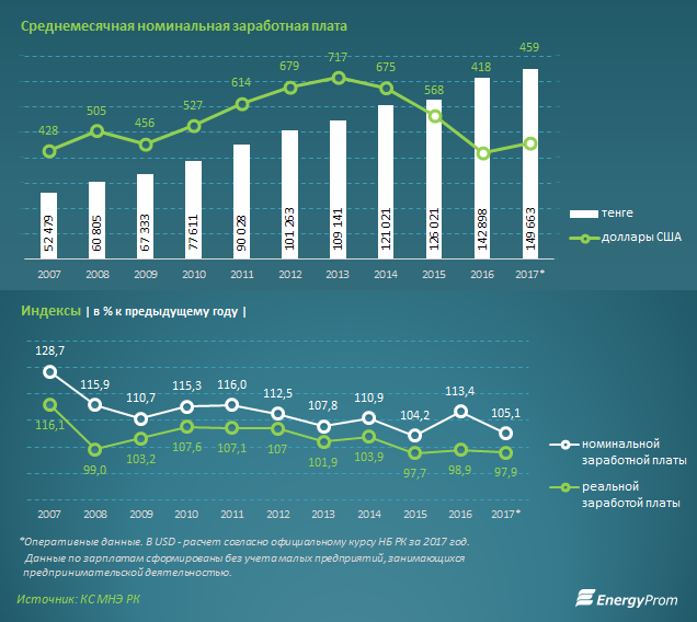 По итогам 2017 года среднемесячные зарплаты в стране составляли 149,7 тысячи тенге (+5 процентов за год), или 459 долларов (+10 процентов за год).