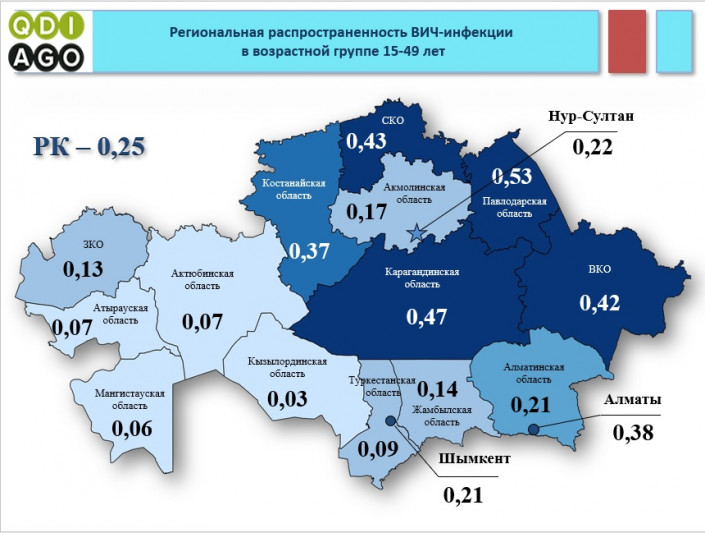 "Казахстан разделен на три региона по распространенности ВИЧ - высокий, средний и низкий. Исторически сложилось так, что высокий уровень распространения ВИЧ-инфекции там, где впервые были зарегистрированы случаи заражения - это Карагандинская, Павлодарская, Северо-Казахстанская, Восточно-Казахстанская, Костанайская области и город Алматы", - рассказал директор Казахского научного центра дерматологии и инфекционных заболеваний Бауыржан Байсеркин.