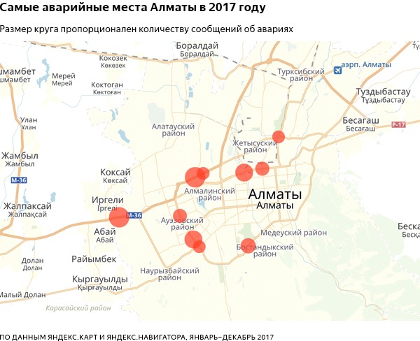Опасность ДТП выше всего на перекрестках магистралей на севере и западе города: опять выделяются проспекты Рыскулова и Райымбека, Ташкентский тракт, улица Саина. Самые опасные места сосредоточены на севере Алматы - шесть из десяти находятся на проспектах Рыскулова и Райымбека.