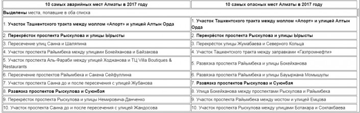 Первые две позиции в рейтингах опасных и аварийных мест совпадают - это участок Ташкентского тракта на выезде из города возле "Алтын Орды" и перекресток проспекта Рыскулова с улицей Ырысты. В оба списка попал еще один участок на проспекте Рыскулова - пересечение с проспектом Суюнбая.