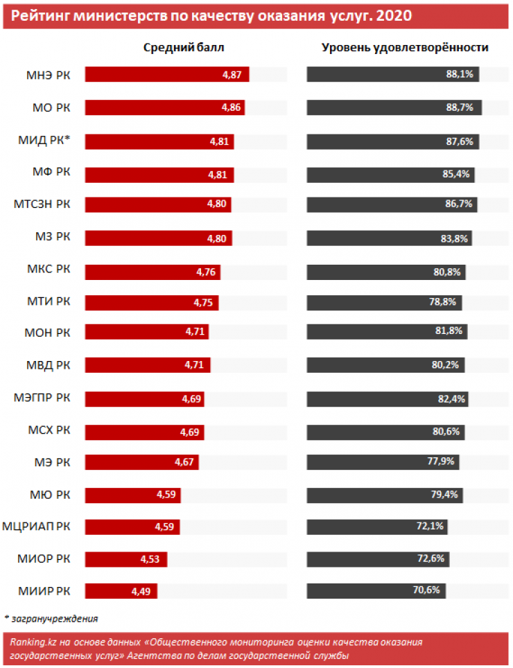 Аутсайдером по качеству оказания услуг за 2020 год стало Министерство индустрии и инфраструктурного развития: у ведомства лишь 4,49 балла и уровень удовлетворенности всего в 70,6 процента.