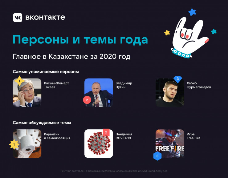 Социальная сеть "ВКонтакте" (VK) рассказала, какие темы и персоны чаще всего обсуждались в Казахстане в 2020 году, передает Tengrinews.kz.