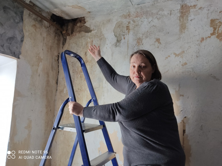 "Когда произошло обрушение в ванной комнате, меня​ по времени разделило 5-7 минут, как я оттуда вышла. Сквозная дыра, очень страшно. Когда вот было потепление, опять здесь все потекло со стен, стоит невыносимый запах. Мы сидим, просто ждем, когда на нас это все обрушится, потому что расселить нас акимат не может без команды свыше, по крайней мере, они нам так говорят", - рассказывает жительница дома Ольга Левченко. ​