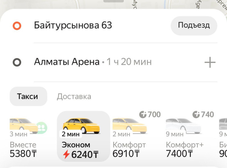 Цены на такси также поднялись. К примеру, чтобы доехать с улицы Байтурсынова, 63, до "Алматы Арены", придется заплатить более 5000 тенге. Даже вариант "с попутчиком" обойдется в 5380 тенге.