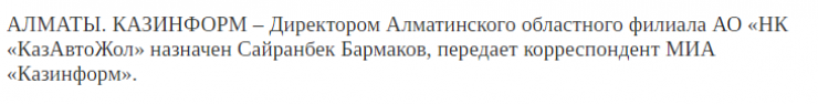 "Касательно новости о назначении бывшего председателя Комитета автомобильных дорог произошло недоразумение. Приносим извинения. Сайранбек Бармаков не назначен и не назначался на должность директора алматинского филиала АО НК "КазАвтоЖол". Данное место вакантно", - заявили в пресс-службе МИИР.