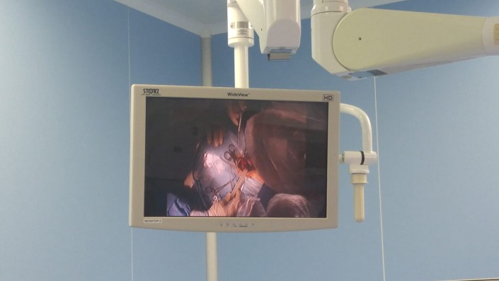 Иностранные коллеги наблюдают за ходом операции на большом экране, сидя в конференц-зале. Оперирующий врач комментирует все действия по громкой связи.