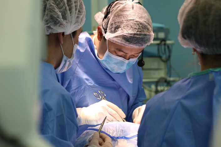 Иностранные коллеги наблюдают за ходом операции на большом экране, сидя в конференц-зале. Оперирующий врач комментирует все действия по громкой связи.