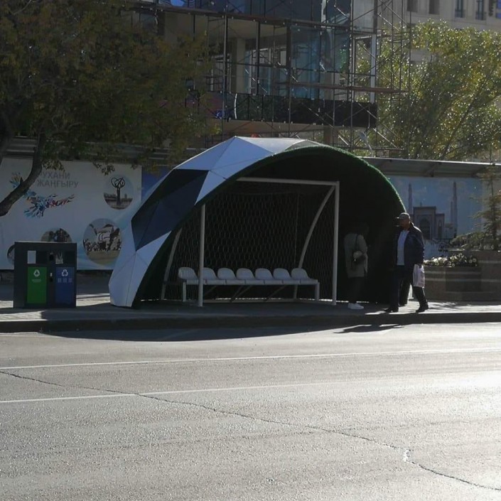 В одном из районов Астаны на днях появилась оригинальная остановка, которую наверняка оценят любители футбола. Об этом на своей странице в Facebook сообщила пресс-секретарь акимата района Сарыарка Бибигуль Абыддин.
