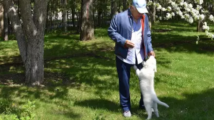 На снимке Назарбаев стоит в цветущем саду с щенком.