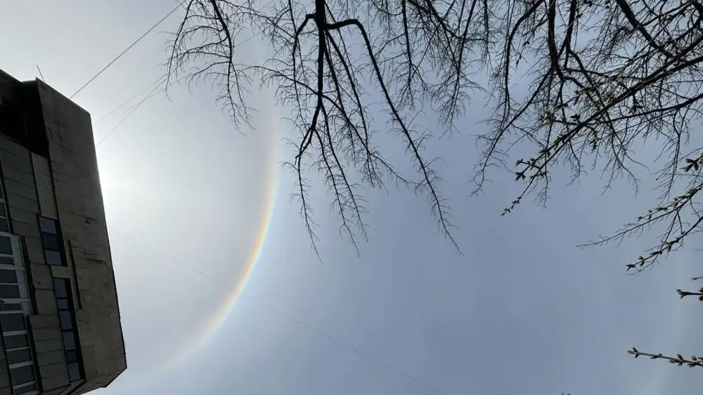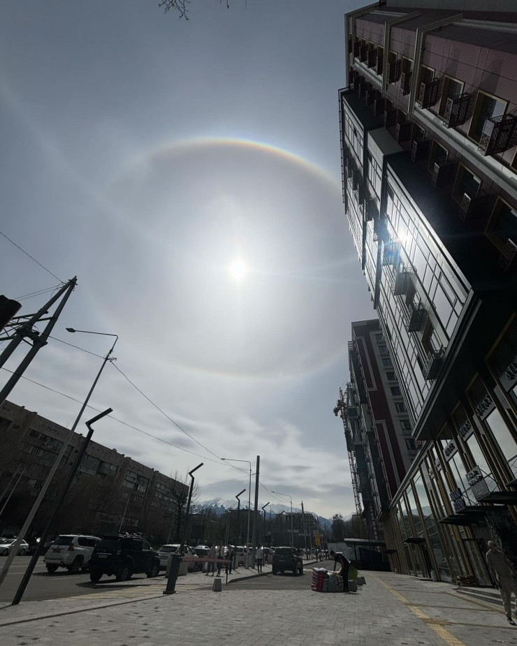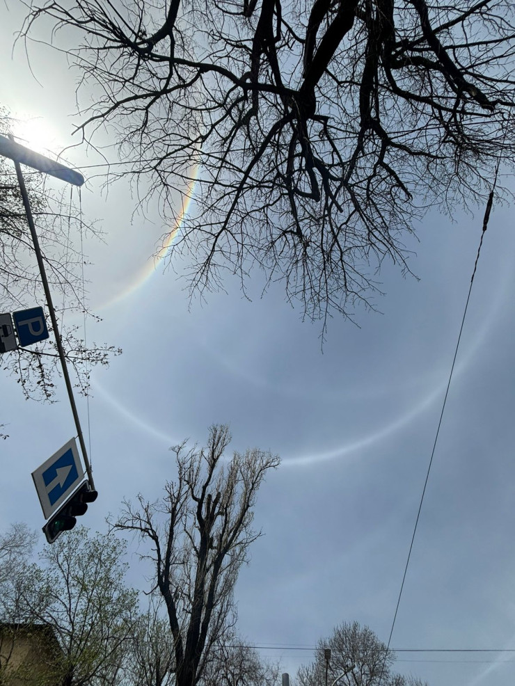 Жители Алматы заметили в небе над городом необычное явление - солнечное гало, передает корреспондент Tengrinews.kz.