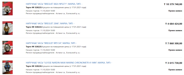 - 8 часов премиальных брендов на сумму 314 742 586 тенге, включая экземпляры стоимостью от 3,5 до 214,5 миллиона тенге;