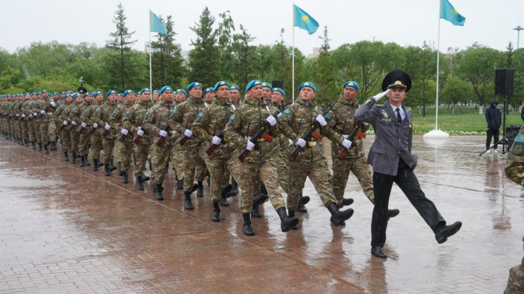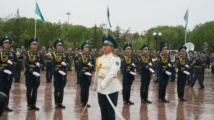 В Астане, где 25 мая выпал снег и прошел сильный дождь, ритуал приведения к военной присяге военнослужащих Президентского полка "Айбын" прошел у монумента "Отан қорғаушылар".