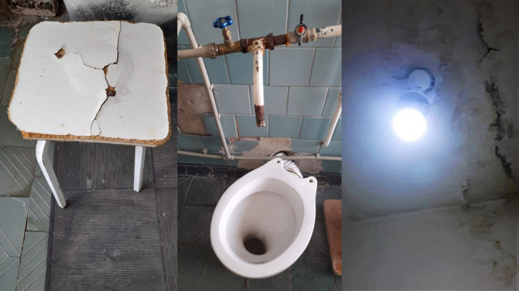 Женщина для наглядности сфотографировала состояние одного из отделений больницы. Хотя передвигается она на коляске, она проехалась по отделению и сделала несколько снимков. Разваливающаяся мебель, протекающие потолки, не приспособленные для нужд пациентов туалетные комнаты. В уборной, например, унитаз не подключен к системе водоснабжения.
