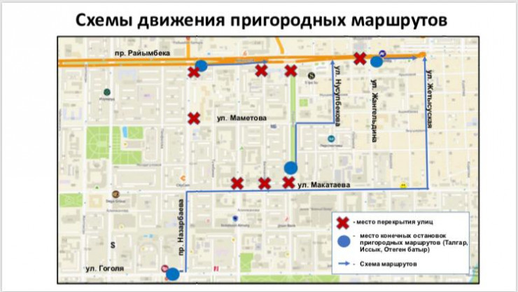 Для пассажиров пригородных сообщений Талгарского, Иссыкского районов и поселка Отеген Батыр будут организованы конечные пункты на участках: проспект Райымбека-Назарбаева, Райымбека-Жангельдина, Пушкина-Макатаева, Гоголя-Назарбаева", - говорится в сообщении.