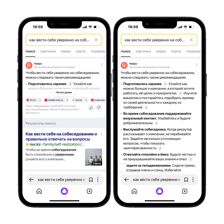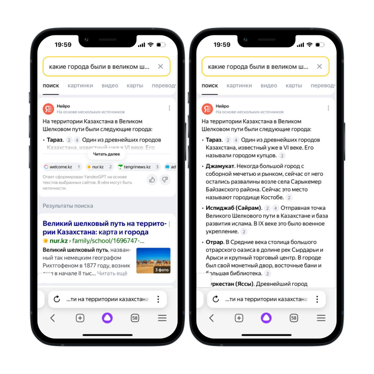 Нейро стал доступен пользователям в Казахстане этим летом. Ранее, чтобы воспользоваться им, нужно было перейти в специальный режим на главной странице Яндекс Поиска, а сейчас ответ на вопрос будет появляться в результатах поисковой выдачи над привычными ссылками на сайты. Перед тем как показать его, нейросети проанализируют запрос пользователя и определят, будет ли ему полезен один ответ на основе нескольких источников.