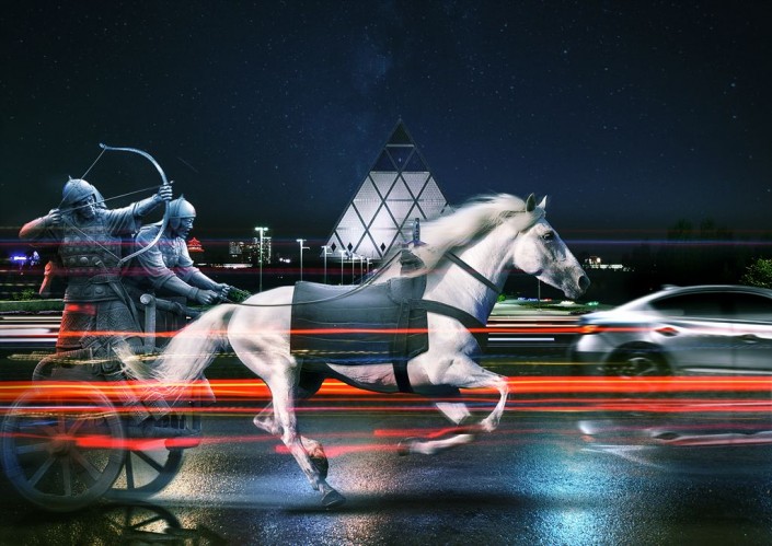 Колесница на улице ночной Астаны. Коллаж Сергея Федорова.