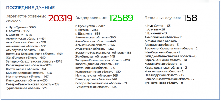 Напомним, сегодня число заражений коронавирусом в Казахстане составило 20 319 случаев. Из них 12 589 человек выздоровели, скончались от болезни 158 пациентов. Таким образом, в стране активно больными остаются 7,8 тысячи зараженных.