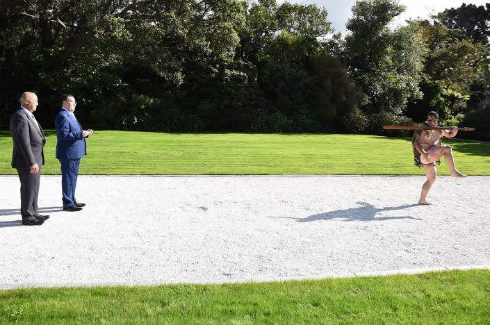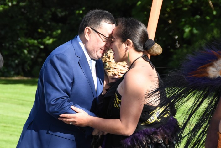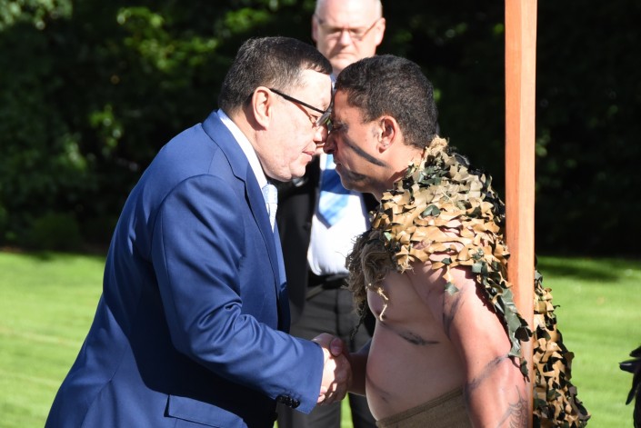 Официальному вручению верительных грамот генерал-губернатору предшествовала традиционная церемония с участием культурной группы новозеландского племени маори, в ходе которого посла Казахстана приветствовали ритуальным танцем хака и традиционным приветствием "хонги" - соприкасание носами.