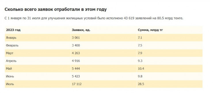 "В июле было исполнено 10 788 заявок от 10 141 человека (часть людей подали несколько заявок) на сумму более 18,4 миллиарда тенге. С 1 января по 31 июля для улучшения жилищных условий было исполнено 43 619 заявлений на 80,5 миллиарда тенге. Если сравнивать статистику изъятий на жилье с аналогичным периодом 2022 года, то тогда было исполнено 592 898 заявлений на 661,4 миллиарда тенге, что почти на 88 процентов больше, чем в 2023 году", - добавили в ЕНПФ.