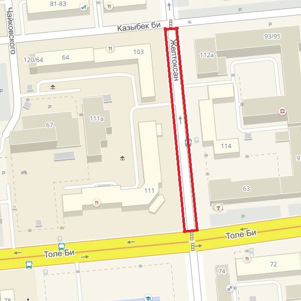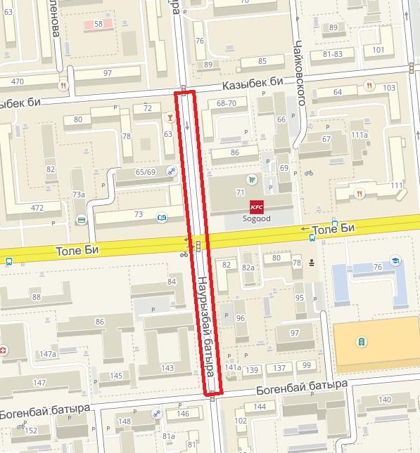 Как поясняется, первый участок расположен по улице Желтоксан и продолжается от улицы Казыбек би до улицы Толе би, на нем расположено 20 парковочных мест.