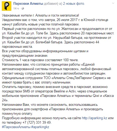 Информацию об этом опубликовало ТОО "Алматы Паркинг" на своей странице в Facebook.