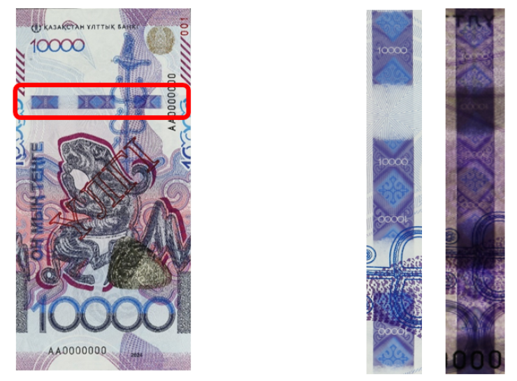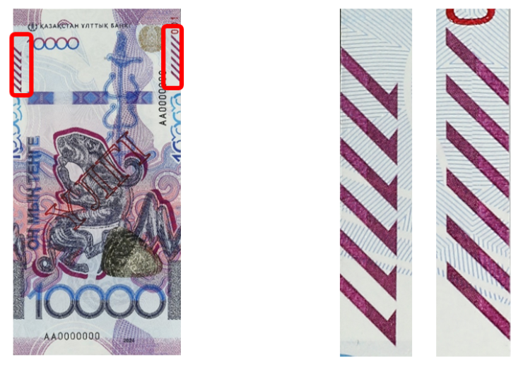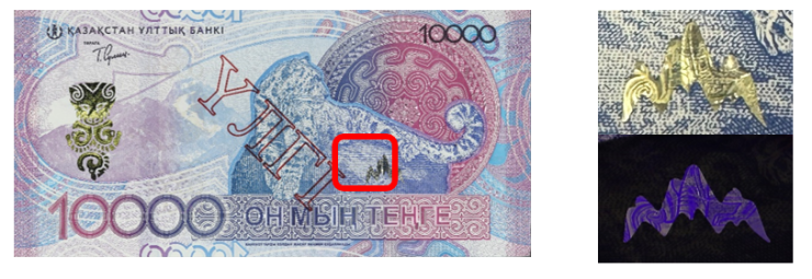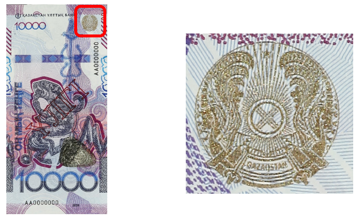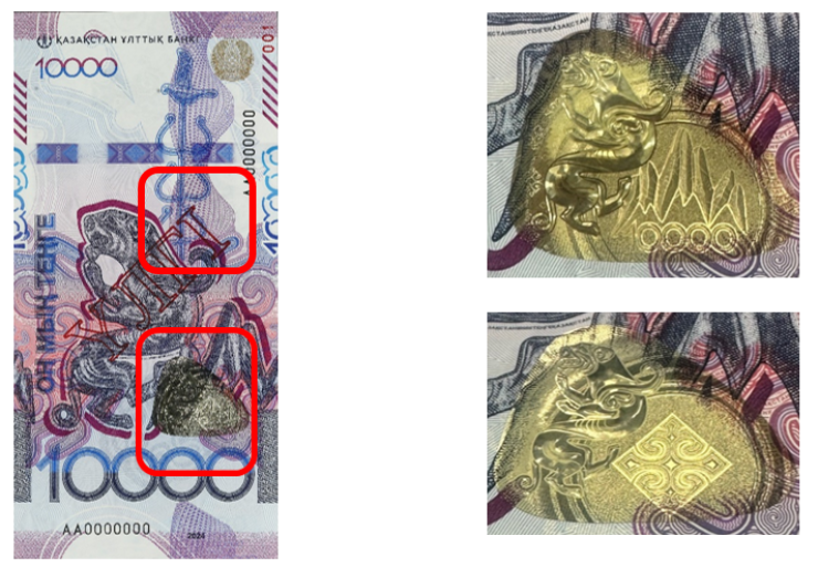 На банкноте использован специальный вид печати, создающий рельеф – золотое интаглио. Герб Казахстана нанесен высокорельефным слоем золотистой металлической краской.